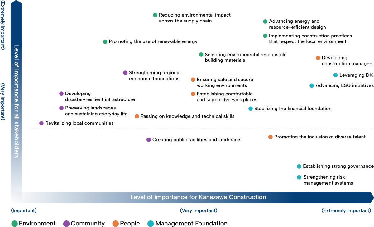 We have organized the key issues identified under each strategies focus area and visualized them in a map. This enables priority challenges, both in terms of societal expectations and corporate activities, to be understood at a glance. Thus, serving as a guide for strategic and concrete initiatives. This map forms the foundation for achieving both sustainable growth and meaningful social contribution.