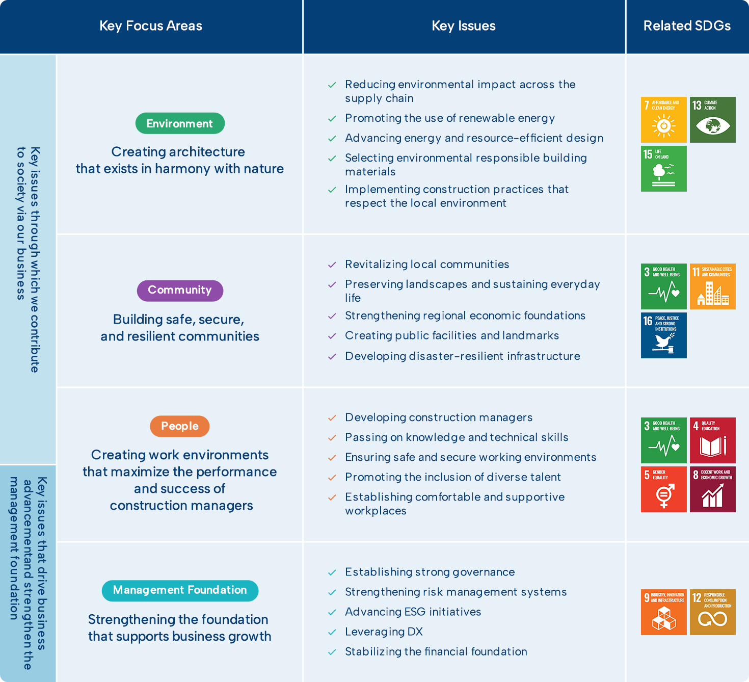 To deliver lasting value to society and local communities through our business activities, we have identified key areas on which to focus. By actively working to solve challenges through our operations, we concentrate on four areas, Nature, People, Community, and Management Foundation, based on material issues that enable social contribution through our business, as well as those that drive business growth and strengthen our management base. Using these themes as a foundation, we visualize priority issues and translate them into concrete initiatives.
