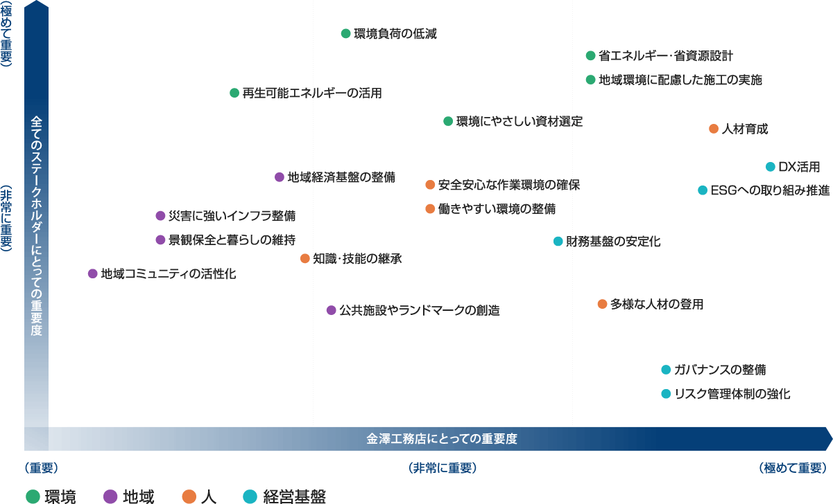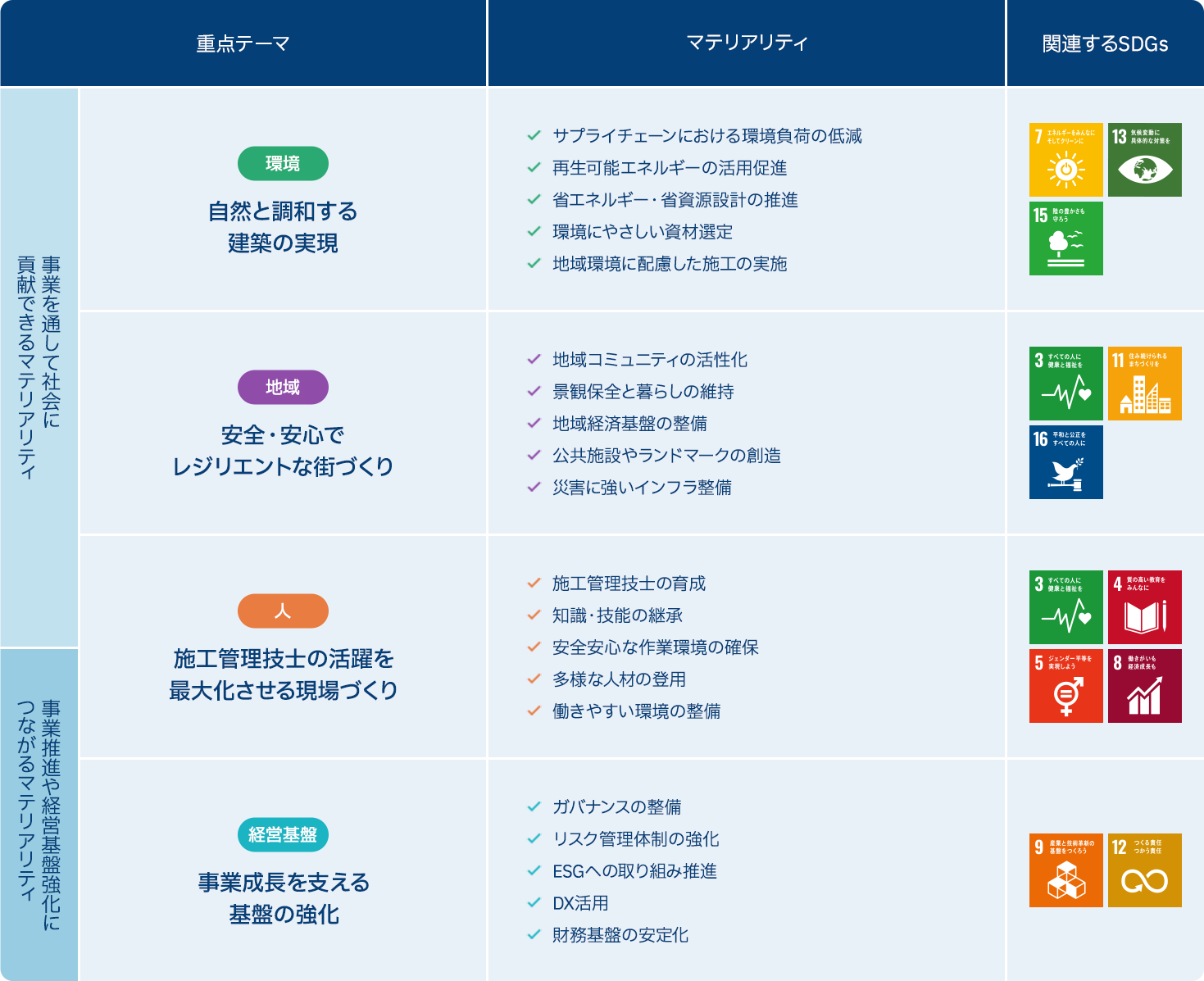 事業活動を通じて社会や地域に持続的な価値を提供するため、重点的に取り組むテーマを設定しました。事業を通じて課題解決に積極的に取り組み、社会に貢献できる重要課題と、事業推進や経営基盤強化につながる重要課題を踏まえ、「自然・人・地域・経営基盤」の4つのテーマに注力しています。これらのテーマを基盤として、重要課題を可視化し、具体的な取り組みへとつなげています。